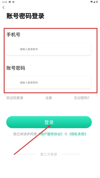 2、进入【账号密码登录】页面,输入已注册的账号及对应的密码,勾选相关协议后点击【登录】按钮,即可完成账号验证流程。