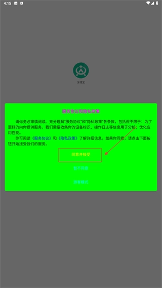 1、启动牙建宝应用,当出现【服务协议和隐私政策】的弹窗时,点击【同意并接受】按钮,即可进入应用后续操作流程。