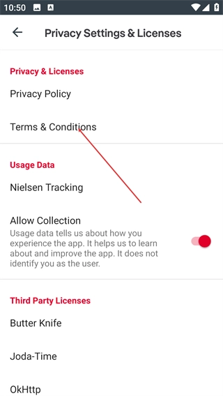 4、在隐私设置页面,用户可以查看【Privacy-Policy】和【Terms-&-Conditions】,同时能够对数据收集权限进行管理。