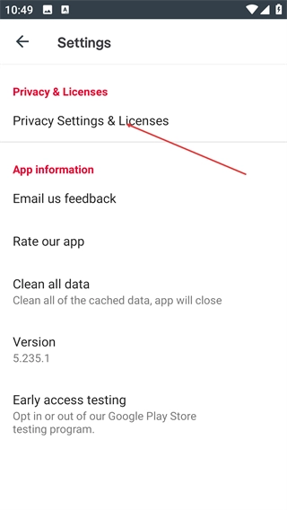 3、在设置页面中找到并选择【Privacy-Settings-&-Licenses】选项,即可进入隐私与许可相关的设置界面。