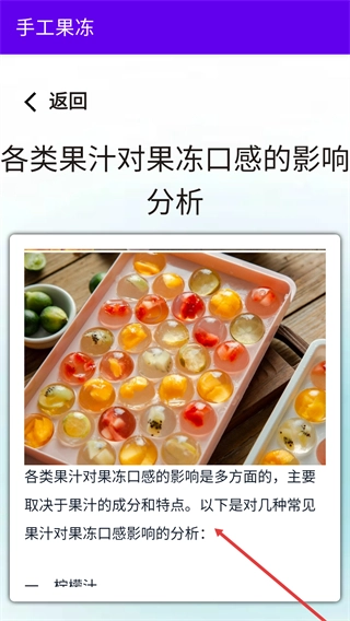 在详情页面中,能够查看不同果汁对果冻口感产生的影响分析,知晓果汁成分和果冻口感之间的关联逻辑。