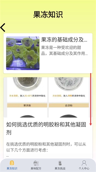 2、在原料与基础准备页面,你可以查看果冻的基础成分、凝固剂的使用方法,还有凝固剂的挑选知识,通过上下滑动能看到更多内容。