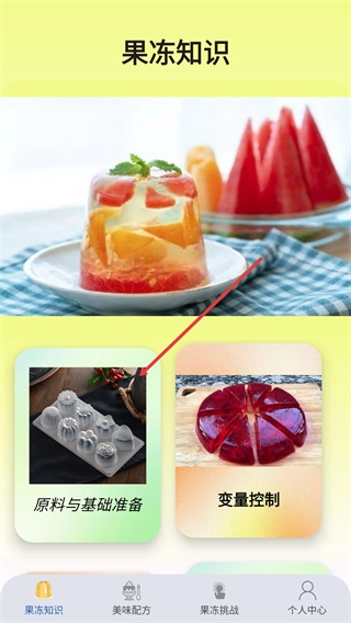 1、在【果冻知识】主界面找到【原料与基础准备】选项并点击,进入该知识板块后,就能查看果冻制作的基础准备相关内容。