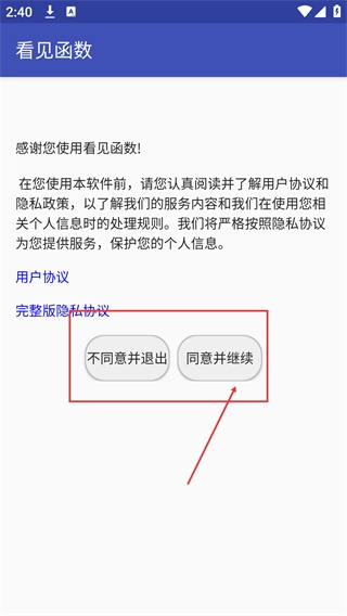 1、在【看见函数】的初始界面,仔细阅读【用户协议】和【隐私协议】后,点击【同意并继续】按钮,就能进入软件主界面进行后续的操作。