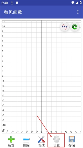 2、进入【看见函数】主界面后,找到底部功能栏里的【设置】按钮,点击该按钮就能进入参数配置界面,对图表相关的功能选项进行调整。