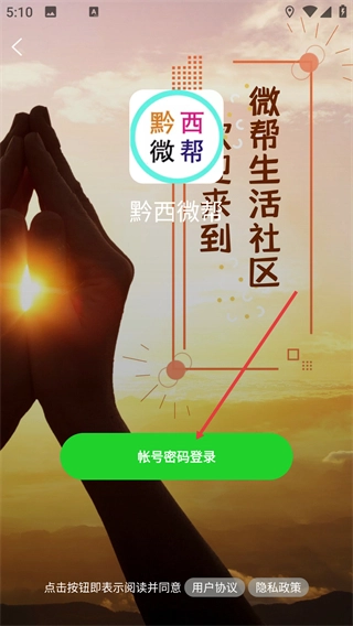 1、在“黔西微帮”的登录选择页面,点击【账号密码登录】按钮,即可进入账号密码的填写界面。