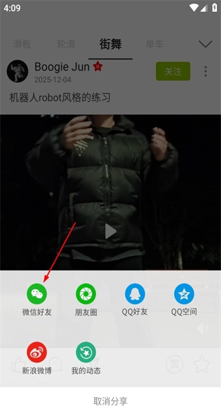 3、在街舞内容板块里找到目标视频,点击视频下方的分享选项,打开分享渠道列表。