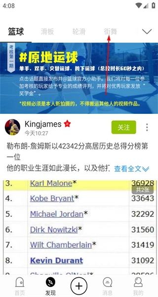 2、进入发现页面后,找到顶部的街舞分类选项,点击该选项切换到街舞相关内容板块。