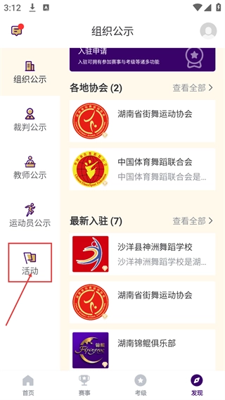 2、在发现页面的左侧菜单栏里,点击【活动】选项,进入活动列表页面,查看各类相关活动信息。