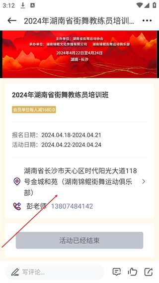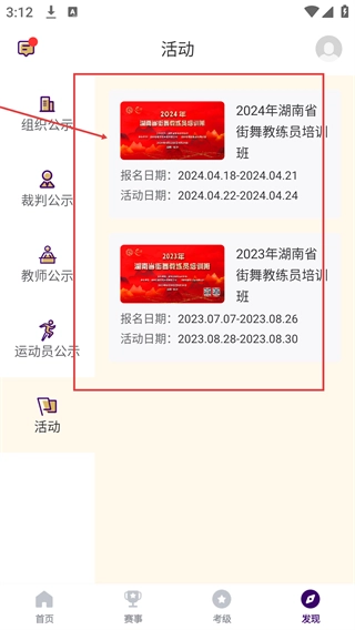 3、在活动列表页面,找到目标活动(例如“2024年湖南省街舞教练员培训班”)并点击,即可进入该活动的详情页面。
