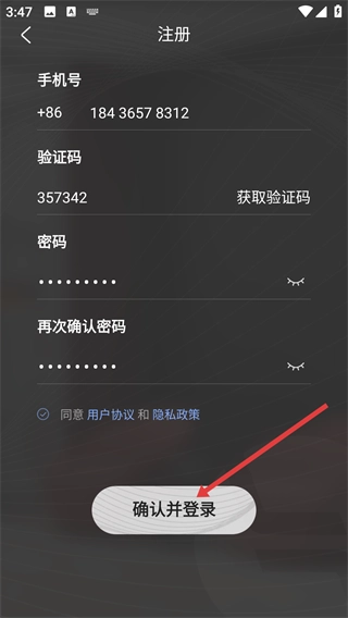 3、在注册页面填写号码、获取并输入验证码,设置并确认密码,勾选同意协议后,点击“确认并登录”按钮,即可完成账号的注册与登录操作。