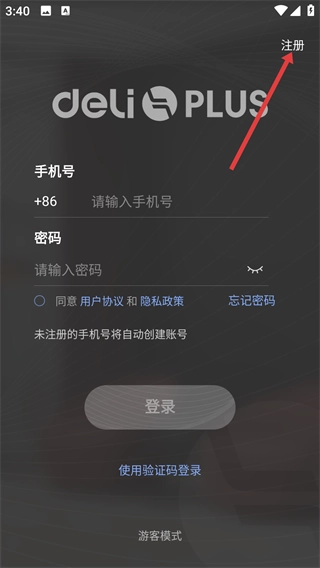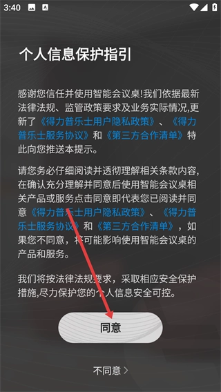 1、仔细阅读《得力音乐士用户隐私政策》及其他相关协议内容后,点击“同意”按钮,即可进入应用的登录界面。