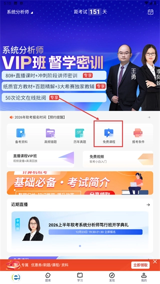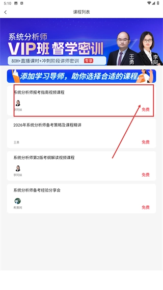 3、在课程列表页面,挑选想要学习的目标课程(例如系统分析师报考指南视频课程),点击该课程即可进入课程详情页面。