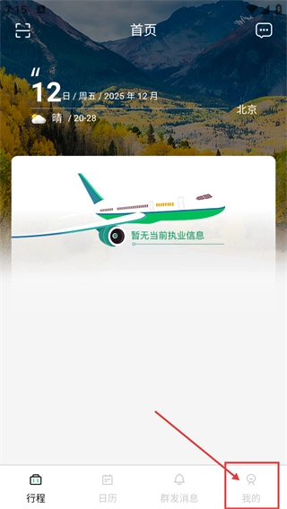 进入首页后,能看到【2025年12月12日 周五】的日期信息,以及【北京 晴 气温20到28度】的天气情况,点击底部的【我的】按钮即可进入个人相关页面。