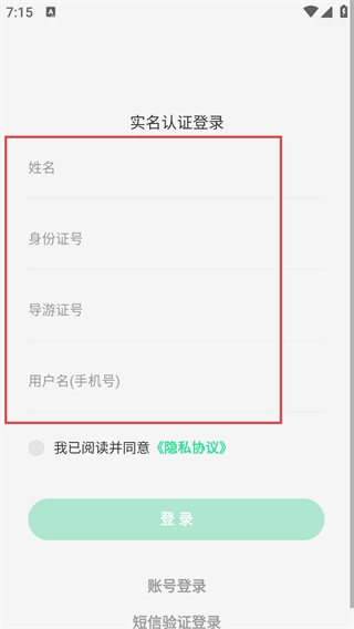 4、选择【实名认证登录】选项,依次填写【姓名】、【身份证号】、【导游证号】和【用户名(号)】,就能完成登录操作。