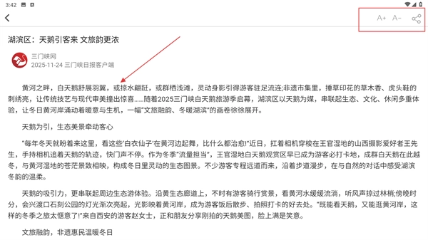 4、在这篇文章的详情页面,你可以了解湖滨区以天鹅为媒介的文旅发展模式,另外还能通过页面右上角的功能按钮来调整字体大小,或者分享这篇文章。