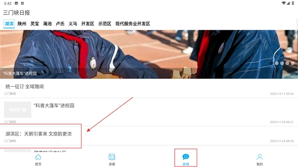 3、切换至“县域”栏目,选取湖滨区的相关资讯,点击《湖滨区:天鹅引客来 文旅韵更浓》这篇文章,查看其中关于文旅融合的内容。