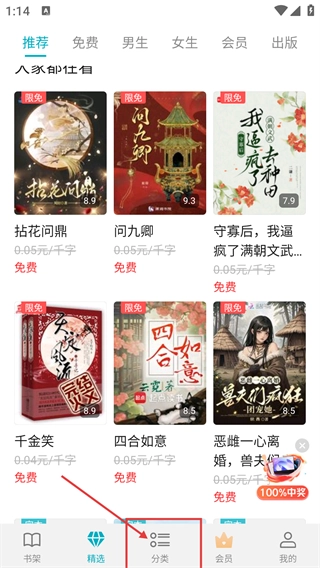 1、在阅读的【精选】页面,点击底部的【分类】按钮,就能进入作品分类界面,方便按类型筛选想要的小说。