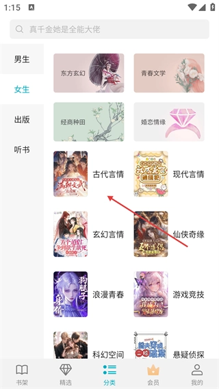 2、进入【分类】页面后,选择【女生】分类下的【古代言情】选项,就能进入该类型的作品聚合页面。