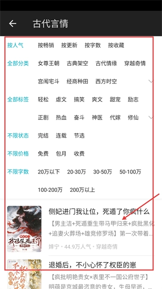 进入【古代言情】分类页面后,可利用【人气】【标签】等筛选条件缩小范围,找到目标小说并进入其详情页。