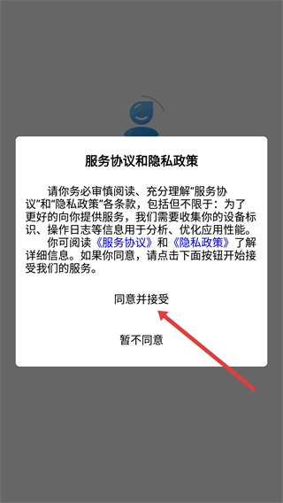 1、仔细阅读《服务协议》和《隐私政策》的各项条款后,点击“同意并接受”按钮,即可进入应用的后续操作界面。