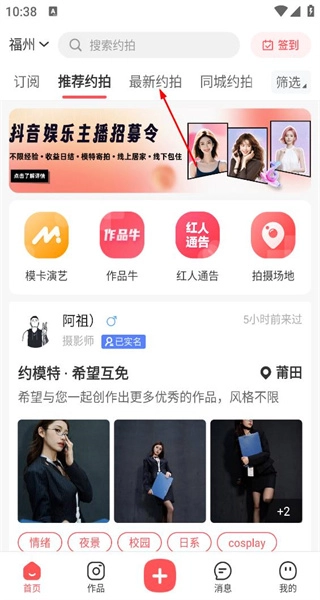 1、打开软件进入首页后,选择约拍分类,即可查看不同模特发布的约拍信息。
