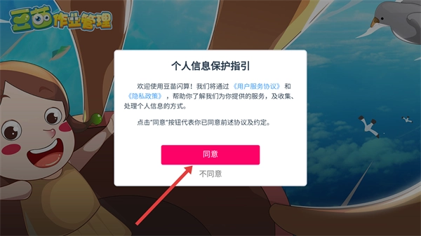 1、进入【豆泡作业管理】界面后,先查看【用户服务协议】与【隐私政策】,再点击【同意】按钮,以此确认协议内容并继续后续操作流程。