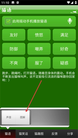 1、进入猫语功能页面后,只需摇动设备就能触发【猫语】音效,以此模拟出对应情绪的猫咪叫声来进行互动。