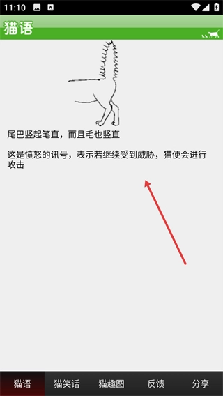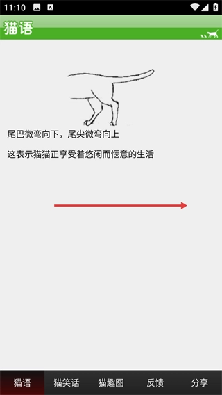 3、在图解页面滑动屏幕,就能切换查看不同【尾巴-姿态】等肢体动作所对应的猫咪情绪含义。
