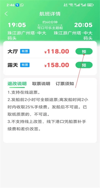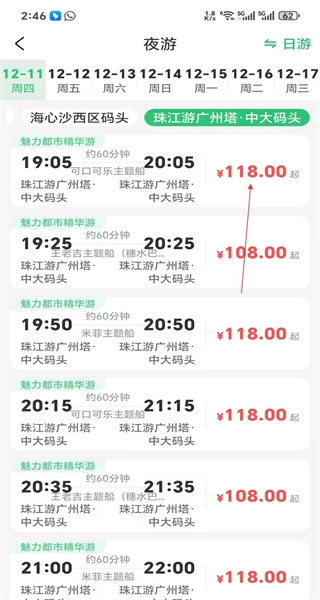 2、进入珠江游页面,确认起点港口和出发时间后,点击查询按钮以获取对应的航班信息。