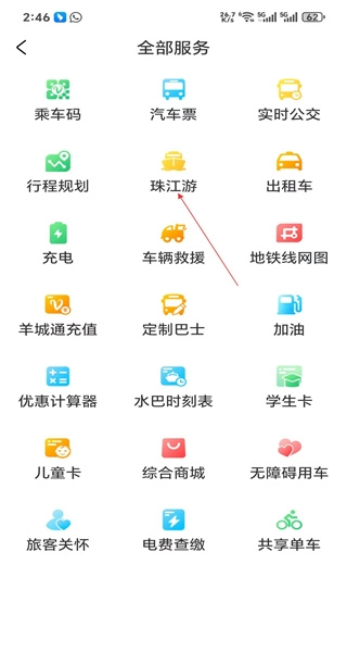 1、启动软件后,进入全部服务界面,查看各类服务选项,找到并点击珠江游选项,进入其对应的预订页面。