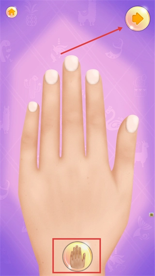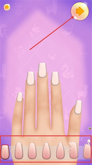 在美甲制作界面,点击手部图标能够切换指甲的展示视角,点击右上角的箭头按钮则可以进入美甲样式的选择环节。