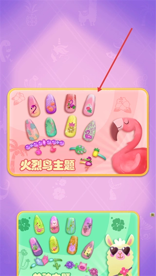 1、在美甲装扮类的主题选择页面,点击【火烈鸟主题】套装所在区域,即可进入美甲制作的操作界面。