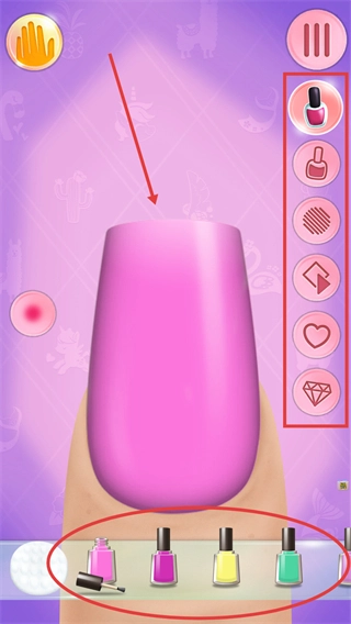 4、进入细节操作界面后,可借助右侧工具栏挑选甲油色彩、装饰纹样等元素,为指甲打造个性化的装饰效果。