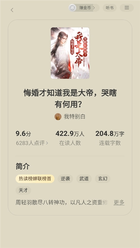 4、挑选对应的书籍后,能查看评分、在读人数、字数、简介等具体的信息。