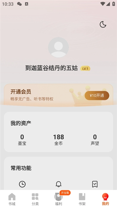 10、进入“我的”界面,能查看个人的墨宝、金币、声望,还可以进行阅读偏好等设置,以上便是阅瓣阅读小说的使用方法。