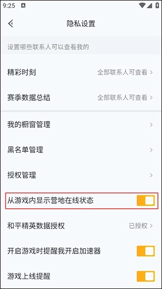 3、进入隐私设置页面后,向下滑动屏幕找到“从游戏内显示营地在线状态”选项,将其右侧的开关按钮关闭就可以了。