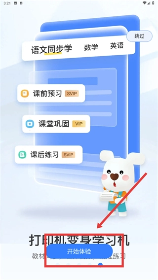 1、在引导页点击【开始体验】按钮,即可进入小白学习打印的功能流程,在该流程中能够选择语文、数学等学科的同步学习模块。