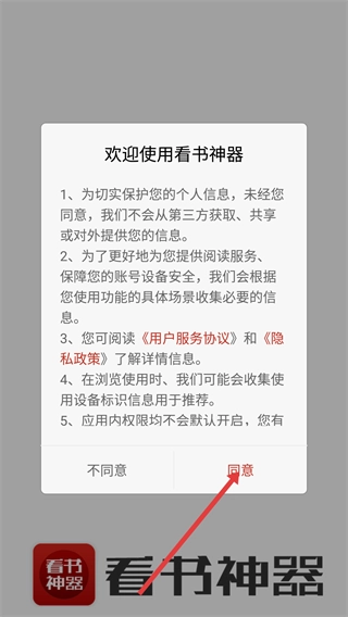 1、阅读《欢迎使用看书神器》的信息保护条款,了解《用户服务协议》《隐私政策》后,点击“同意”按钮即可进入应用。