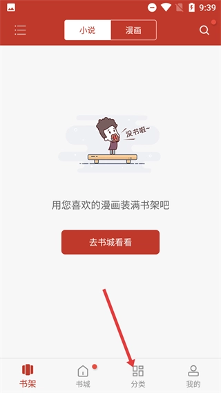 2、在应用界面中切换“小说”与“漫画”标签,若书架没有内容,点击“去书城看看”按钮,然后通过底部的“分类”入口查找相关内容。