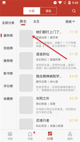 3、进入【分类】页面后,选择【男生】频道,接着查看【最热】-【完结榜】等各类榜单,然后挑选自己感兴趣的作品进入详情页面。
