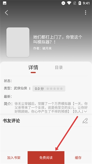 4、进入书籍详情页面,查看【状态】-【简介】等相关信息后,点击【阅读】按钮就能开始阅读这部作品。