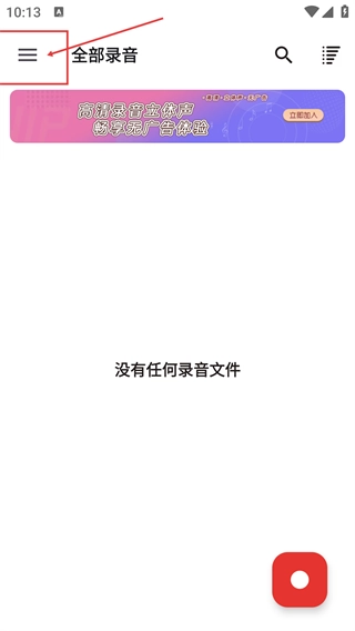 2、进入【全部录音】页面后,点击左上角的三条杠图标即可打开功能菜单;若当前没有录音文件,页面会显示对应的空状态提示。
