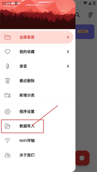 3、打开侧边功能菜单后,找到【数据导入】选项,借助该功能能够导入外部录音数据,菜单里还包含收藏、设置等功能。