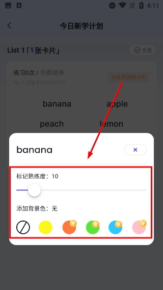 4、在标记面板里,能够设置熟悉度数值、挑选背景色,以此完成对单词的个性化标记,从而帮助后续的复习。