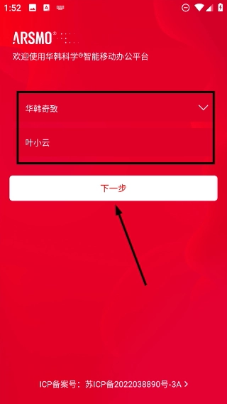 3、进入平台欢迎界面后,先确认已选定的【华铸奇教】组织和【叶小云】账号无误,再点击【下一步】按钮,继续完成登录流程。