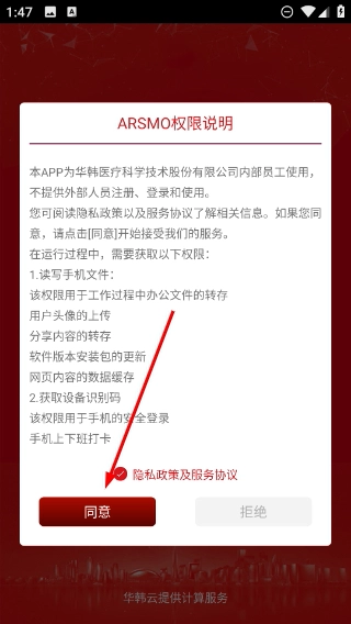 1、在【ARSMO权限说明】窗口里,仔细阅读权限相关内容后,点击【同意】按钮,就能确认权限并继续使用这个内部办公平台。