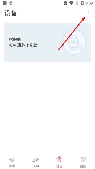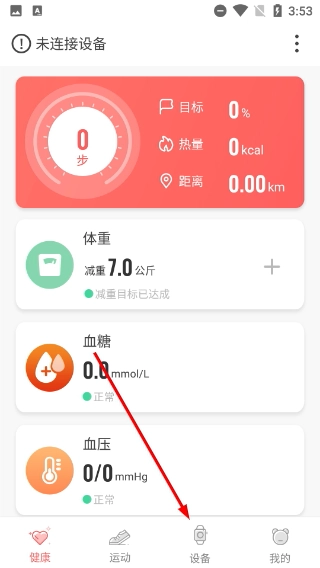1、打开健康应用后,在首页点击底部的【设备】选项,即可进入设备管理页面,在此页面能够开展智能设备的连接操作。