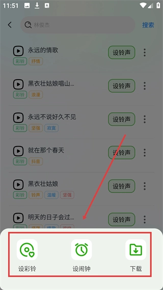 2、在搜索框中输入内容后,点击右上角的【搜索】按钮,即可触发搜索并展示对应的彩铃结果列表。