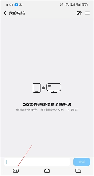 1、启动软件后,进入“我的电脑”界面,看到文件跨端传输的提示信息,点击图片图标,即可进入最近照片的选择页面。